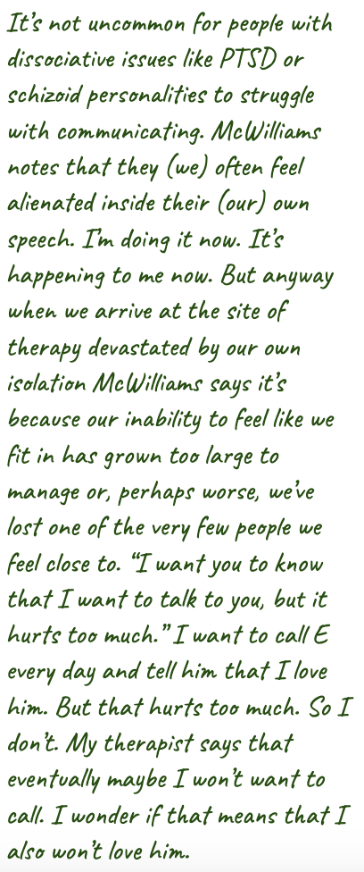 It’s not uncommon for people with dissociative issues like PTSD or schizoid personalities to struggle with communicating. McWilliams notes that they (we) often feel alienated inside their (our) own speech. I’m doing it now. It’s happening to me now. But anyway when we arrive at the site of therapy devastated by our own isolation McWilliams says it’s because our inability to feel like we fit in has grown too large to manage or, perhaps worse, we’ve lost one of the very few people we feel close to. “I want you to know that I want to talk to you, but it hurts too much.” I want to call E every day and tell him that I love him. But that hurts too much. So I don’t. My therapist says that eventually maybe I won’t want to call. I wonder if that means that I also won’t love him.