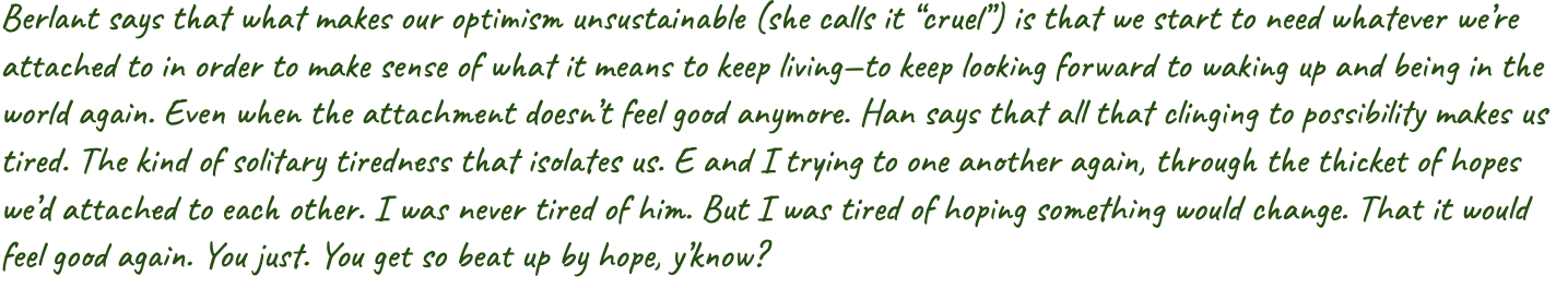 Berlant says that what makes our optimism unsustainable (she calls it “cruel”) is that we start to need whatever we’re attached to in order to make sense of what it means to keep living—to keep looking forward to waking up and being in the world again. Even when the attachment doesn’t feel good anymore. Han says that all that clinging to possibility makes us tired. The kind of solitary tiredness that isolates us. E and I trying to find one another again, through the thicket of hopes we’d attached to each other. I was never tired of him. But I was tired of hoping something would change. That it would feel good again. You get so beat up by hope, y’know?