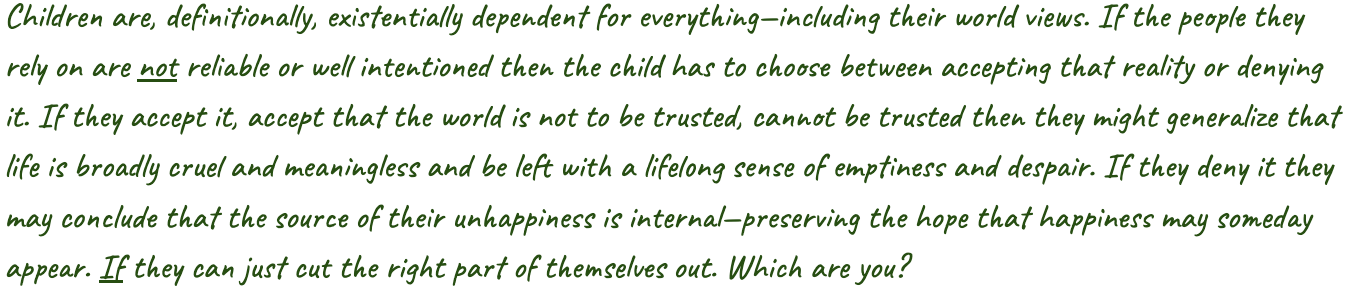 Children are, definitionally, existentially dependent for everything—including their world views. If the people they rely on are not reliable or well intentioned then the child has to choose between accepting that reality or denying it. If they accept it, accept that the world is not to be trusted, cannot be trusted then they might generalize that life is broadly cruel and meaningless and be left with a lifelong sense of emptiness and despair. If they deny it they may conclude that the source of their unhappiness is internal—preserving the hope that happiness may someday appear. If they can just cut the right part of themselves out. Which are you?